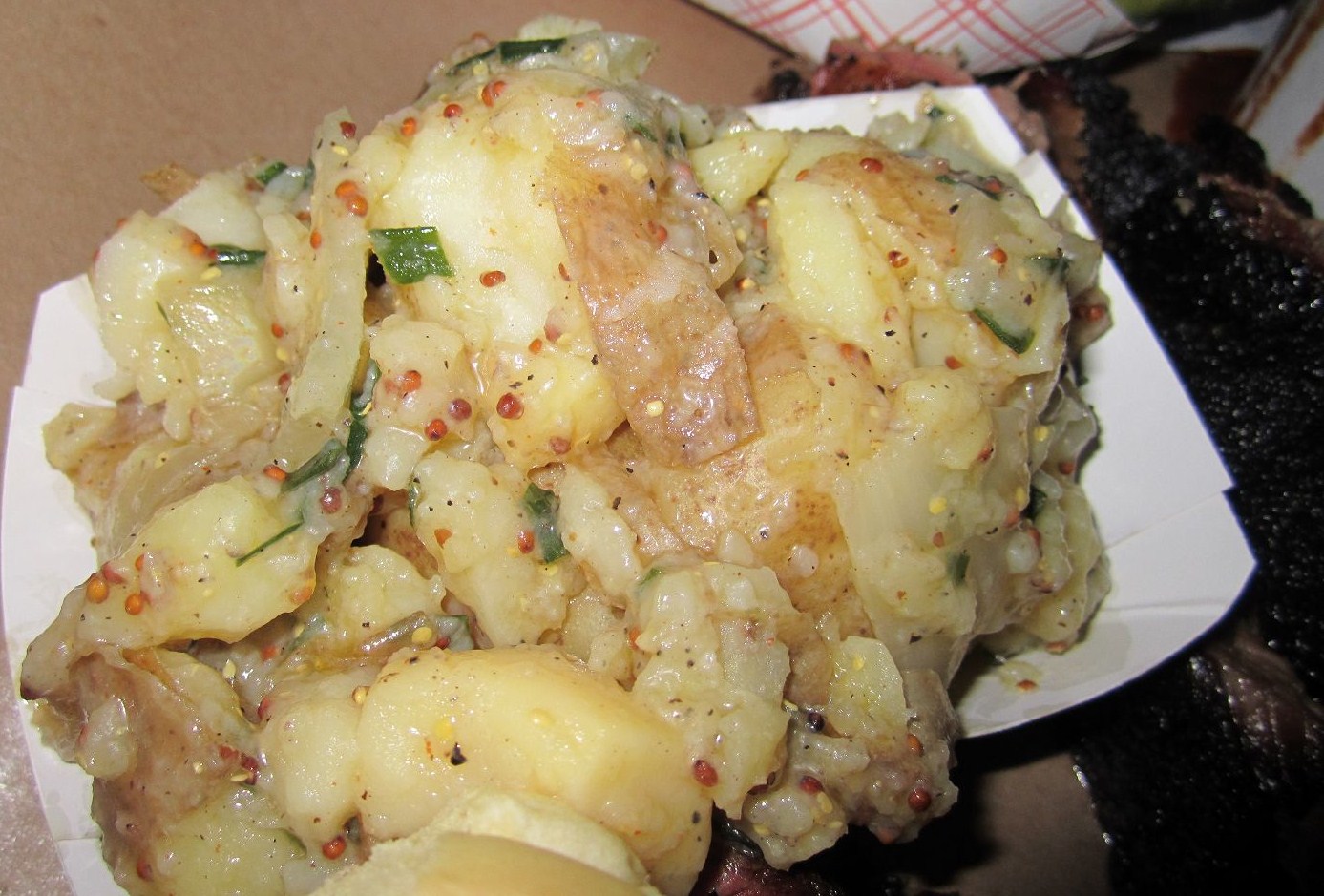 While on line we had plenty of time to study the menu, so it was easy to make our selections despite some of our choices selling out. It’s important to keep in mind going in, that all of Fette Sau’s meats are smoked in-house and prepared with the restaurant’s own house made dry rub. And their menu literally changes daily, so don’t fall in love with what you’re about to read. Make sure to call ahead first or prepare to be surprised. During our Friday night visit, the wait was a manageable one. Opting to taste a few different meats, we ordered up the “Hand Pulled Berkshire Pork Shoulder ($16 lb.),†a juicy platter of tenderly shredded pork, expertly cooked to burnt ends, and smacked down on a thin sheet of brown butcher paper. Delicious enough on its own, a few dollops of tangy barbeque sauce really opened up the pork’s naturally delicious flavors. The “Beef Brisket†($16 lb.) also provided some tasty burned to a crisp ends, with a rich, deep smoke-filled taste, while the “Berkshire Sausage†($3 link) provided a juicy saltiness, with just enough spice to make us reach for a slug of beer. The sides proved just as essential to rounding out our meal as our main dishes did. “Dante’s German Potato Salad†($3.25 small; $5.25 large) was downright outstanding, mixing a lighter sweeter salad than we’re used to with the creamy profile of the potatoes. The large order of “Guss’ Pickles†($1.50 small; $3 large) and the sweet small helping of “Burnt End Baked Beans†($5.25 small; $8 large) gave us an array of tastes offered up by these Williamsburg grill masters.