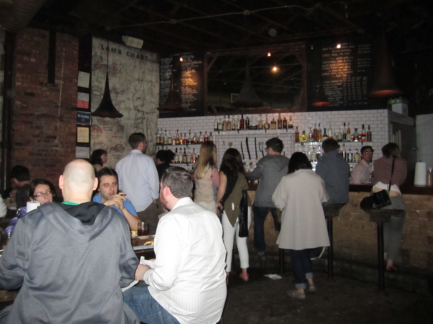 The nondescript pink sign overhead is hardly illuminated bright enough to be all that noticeable by passersby, but the energy overheard by hungry meat indulgers is infectious- from their shiny greasy cheeks to the toasting of growlers from opposite sides of the lengthy wooden picnic tables surrounding the restaurant’s exterior. Beside the tables is usually an extended snaking line which you should jump on immediately upon arriving, while the rest of your party divides between loading up on beer from the bar, and finding ample space to get comfortable at the first come first serve style restaurant. Needless to say, reservations here do not exist. Inside, tables are placed almost everywhere in order to bring the number of hungry patrons to maximum capacity, while the bar has counter-side stool seating coupled with craft beers by the gallon and an oversized list of whiskies for your sipping pleasure.