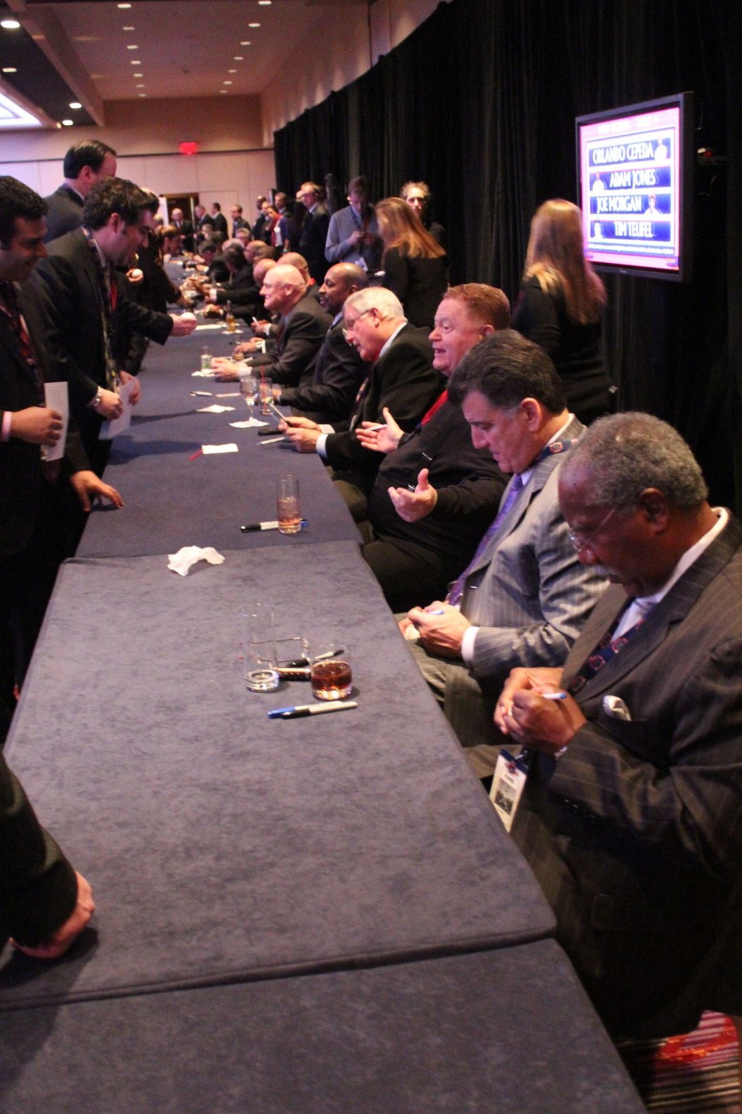 As the cocktail hour kicked off, fans quickly formed into lines near the separate autograph tables. Each attendee was handed a baseball upon arriving into the ballroom and flashing camera bulbs began almost instantaneously as eventgoers shook hands with the likes of Rollie Fingers, Rusty Staub, Keith Hernandez, Jack Morris, John Franco, Pat Gillick, Willie Randolph, and Tommy John, to name a few as well as current stars Adam Jones and Joba Chamberlain, the 2013 recipient of the Bart Giamatti Award. Guests were also treated to pose for photos alongside the San Francisco Giants 2012 World Series Trophy, next to a blow up photo of Yogi Berra, or with the players themselves. In fact, perhaps the most remarkable part of the evening was watching the lines of grown men, holding 8×10 photos and cartons of blank baseballs for the players to sign, gathering with other likeminded fans to point out one player or another, and the sheer bliss on their faces when given a few moments to chat with the players that they grew up idolizing. Despite the fact that most of them were middle-aged, it certainly goes to show you baseball’s everlasting impact- it makes you feel like a kid again.
