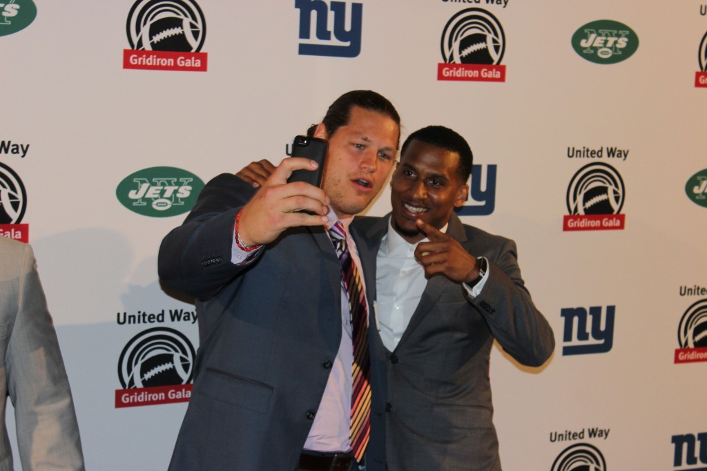 Though Cruz and Wilkerson’s arrival certainly generated a great deal of buzz, they were hardly alone. Legendary Jets Hall of Fame Quarterback Joe Namath was all smiles amid the flashing of bulbs on the red carpet, flashed by professional and amateur styles of paparazzi (guests with their phones in hand). Namath signed autographs, posed for pictures with fans and conversed with guests that flocked to surround him quickly and aggressively- but to his credit, ‘Broadway Joe’ took it all in with supreme class. Newly acquired Giants’ free agent Walter Thurmond, III joined the likes of Henry Hynoski, Prince Amukamara, Jameel McClain, Spencer Paysinger and Markus Kuhn and the Jets’ Willie Colon to name a few players dressed to the nines and posing for photographers. Meanwhile, once off the carpet, the players were seemingly mobbed by anxious fans ranging from women to children to grown men, excited to greet their heroes and head into the evening’s main program with signed footballs in hand.
