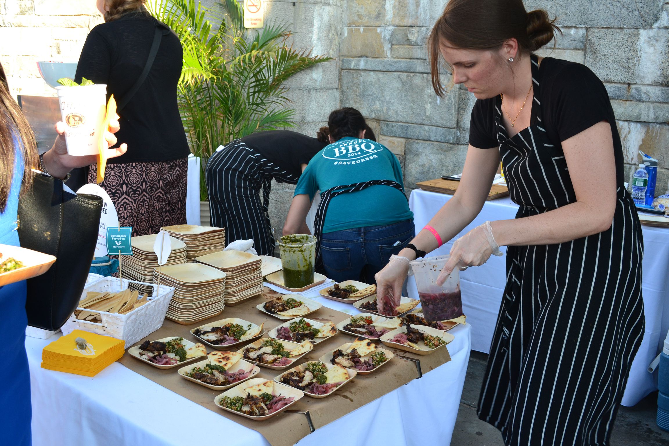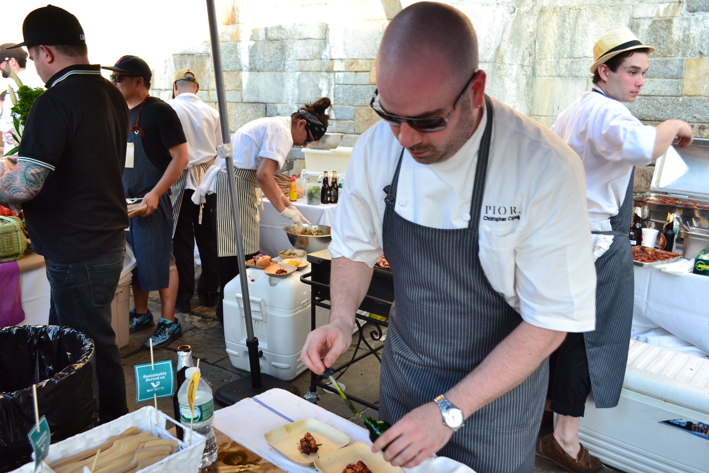 Verterra was on site providing stylish sustainable plates and utensils made from fallen leaves, stacked high at each station.  Guests were greeted upon entry by Saveur’s own Test Kitchen courtesy of Kalamazoo Outdoor Gourmet.  Their “Iraqi Yellow Spice-Rubbed Chicken” was served up with a sweetly acidic hit from a side of onion pickles and paired with tabouleh loaded with fresh green herbs.  They also hosted world renowned Pizza Chef Roberto Caporuscio, happily manning the oven and serving up slices of zesty “Margherita” and “Pepperoni” pies among a variety of others.  Those of us with fast hands were lucky to grab a “White Slice with Lemon and Smoked Mozzarella,” an unexpected pairing that served to nicely balance one another.